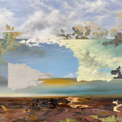 With glitch-like forms and soft color palettes I try to capture the sensory overload we live with daily - not just digitally, but environmentally. The work echoes the visual and auditory noise that surrounds us, as well as the real pollution seeping into our natural world. Fragile, flickering elements speak to the way beauty and degradation now coexist. This body of work reflects a dual reality: one of quiet longing, and one shaped by chaos - both manmade and environmental."