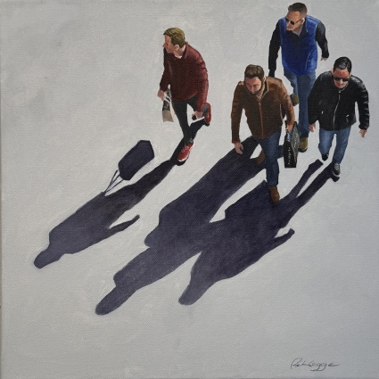 The focus on patterns, shadows and interactions highlights the subtle links between individuals and their shared environments. For example, the long shadows in my work symbolize the invisible threads that connect people, even in moments of isolation, This duality, distance and intimacy, makes my art a poignant exploration of the fragility and resilience of human relationships in a changed world."
