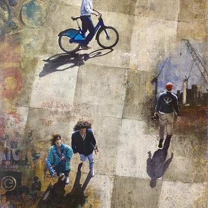 "The voyeuristic perspective in my artwork captures the emotional tension between isolation and connection, shaped by my reflections in the wake of 9-11. Observing life from elevated viewpoints, such as windows or bridges, I create a sense of detachment that emphasizes physical and emotional distance. At the same time, my curiosity about human behavior fosters a sense of connection.