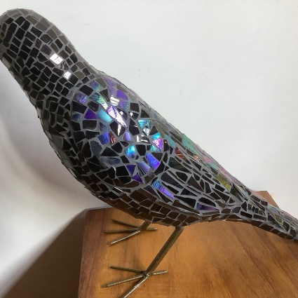 As a child I loved to put puzzles together. My mosaic work is like covering a form with a puzzle. I started out being a potter and working with clay and all its glory. I love to collect beautiful China, and then process it into color shards, which I use in my work. I repurpose table ware. My connection with Lundberg glass has given me an opportunity to use phenomenal iridescent glass in my work.