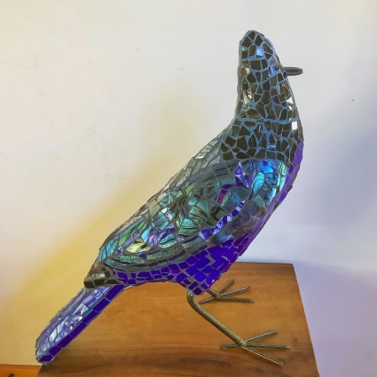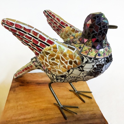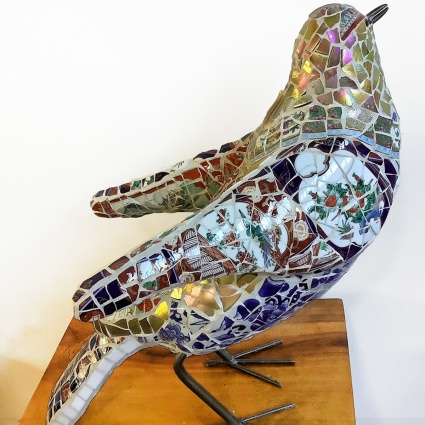 Creating her artwork is a painstaking process. To begin, she starts “by bending rebar (a strong steel bar used to reinforce cement girders) into the shape. "I had to learn to weld so I could connect the pieces together.” Next, she wraps the frame in chicken wire to prepare it for stucco cementing. She then painstakingly breaks and applies mosaic shards, grouts the piece and water seals it.