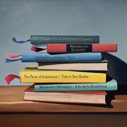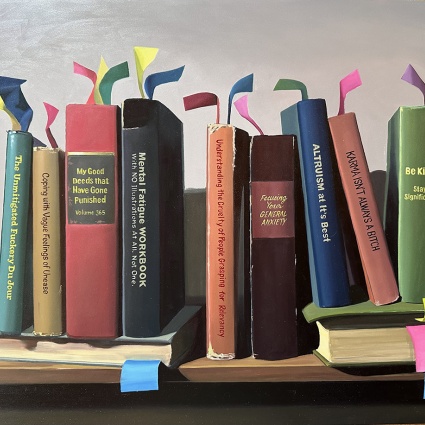 "My book paintings are my way of poking fun at self-help and everyday thoughts - those things we all think but don’t usually say out loud. I giggle making them, and it’s the best when someone laughs and says, ‘Oh, that’s so me!’ If my work gets you to smile while I’m working through my own quirks, then I’ve done my job."