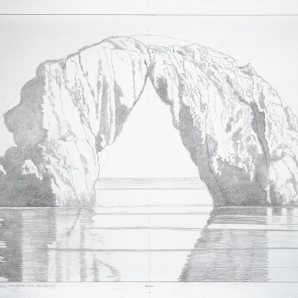 Italy has long been an inspiration to me. While on the Tuscan Coast in 2014 I made a small drawing of a rock formation containing a shrine set in a quiet sea and sheltered by an Italian pine. My “shrine” consisted of a plinth, a stone sphere and a small fire. The idea was to honor Florentine architect, artist and writer, Leon Battista Alberti, (1404-1472). In 1997 I had painted a large still life with a white sphere and the inscription, “VERUM PHILOSOPHIUM,” or, True Philosophy. In his book, “De re Aedificatoria,” Alberti wrote that, "nature herself enjoys the round form above all others as is proven by her own creations such as the globe..." I made four finished studies of “Magna Fide.” The large, final version is now in the Collection of the Monterey Museum of Art.
