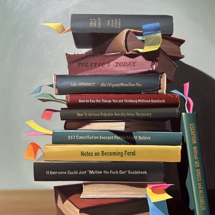 "My book paintings are my way of poking fun at self-help and everyday thoughts - those things we all think but don’t usually say out loud. I giggle making them, and it’s the best when someone laughs and says, ‘Oh, that’s so me!’ If my work gets you to smile while I’m working through my own quirks, then I’ve done my job."