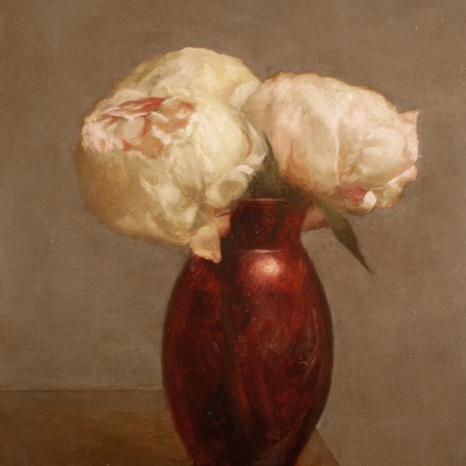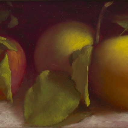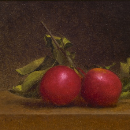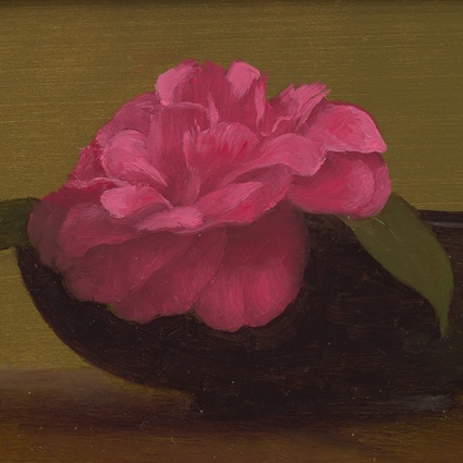 Koch’s paintings generally focus on one subject, primarily fruit or flowers. His single fuzzy peach, Stem and Leaf Peach, 2022 or his two yellow apples with their leaves, Ginger Gold Apples, 2023, or his creamy white camelias, Camelias with Ceramic Bowl, 2021 are wonderful examples. They testify to an artist who understands how to look deeply, and whose skillfully wielded brush moves in complete harmony with his eye. The three small paintings bring the viewer in close, giving them access to each nuance of light and color in their hushed and intimate spaces. Occasionally Koch will embrace a larger, more complex subject, like his stunning Marigolds, 2024, which depicts an impressive bouquet of the bright orange blossoms with their feathery green leaves, set in a brassy, reflective vase. With an infinity of small brushstrokes, he picks out a fathomless array of tiny petals sparkling with minute variations of their unmistakable hue. This vibrant ode to an iconic fall flower also carries with it the implications of Day of the Dead graveyard celebrations, giving it momentous presence and complexity along with its splendor.